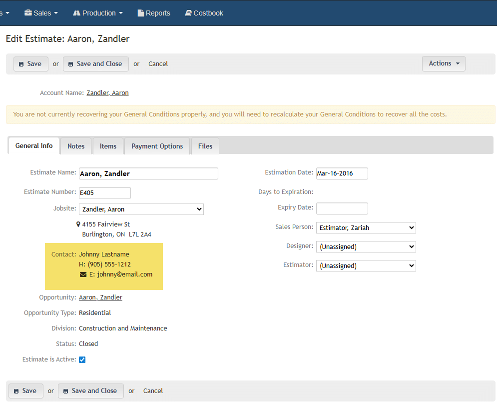 - Account contact on Construction Estimate: The primary contact information (based on the linked Opportunity) is now shown in the ‘General Info’ tab of Construction Estimates.