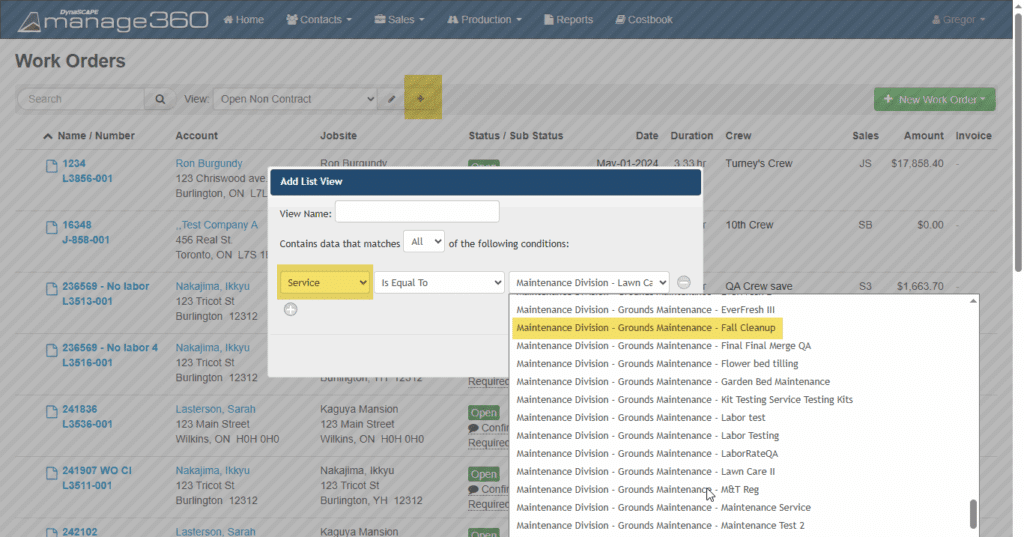 - Work Order List Page: We have added the ability to include the Service as part of the View builder for the Work Order list page. It will be listed as DIVISION NAME – SERVICE CATEGORY – SERVICE NAME
